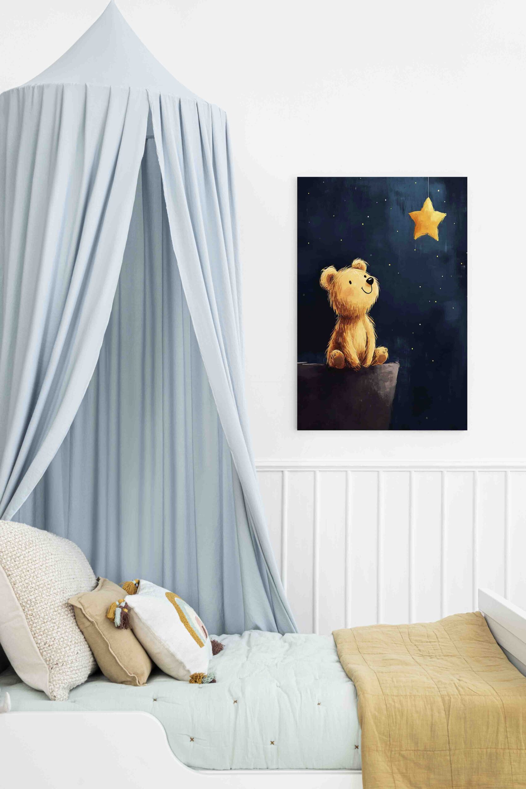 Snový obraz medvídka pod noční oblohou vnese do dětského pokoje kouzlo a tajemství vesmíru. Tento poetický motiv na kvalitním plátně zobrazuje medvídka pozorujícího hvězdnou oblohu, což stimuluje zvídavost a lásku k přírodním divům. Tmavé odstíny noční oblohy kontrastující s jemnými detaily vytváří uklidňující atmosféru ideální pro usínání. Obraz podporuje dětskou představivost o širém vesmíru a nekonečných možnostech. Perfektní dekorace pro malé snílky a budoucí astronomy.