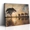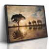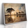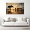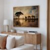Fascinující pohled na sloní rodinu kráčející v řadě africkou savanou. Obraz zachycuje přirozené chování těchto sociálních zvířat, kdy mladší členové následují zkušenější jedince. Postupné zmenšování postav od největšího po nejmenšího vytváří přirozenou perspektivu a rytmus. Teplé barvy zapadajícího slunce dotvářejí atmosféru poklidného putování divočinou. Kvalitní tisk na prémiové plátno zajišťuje ostrost detailů a věrné podání barev.